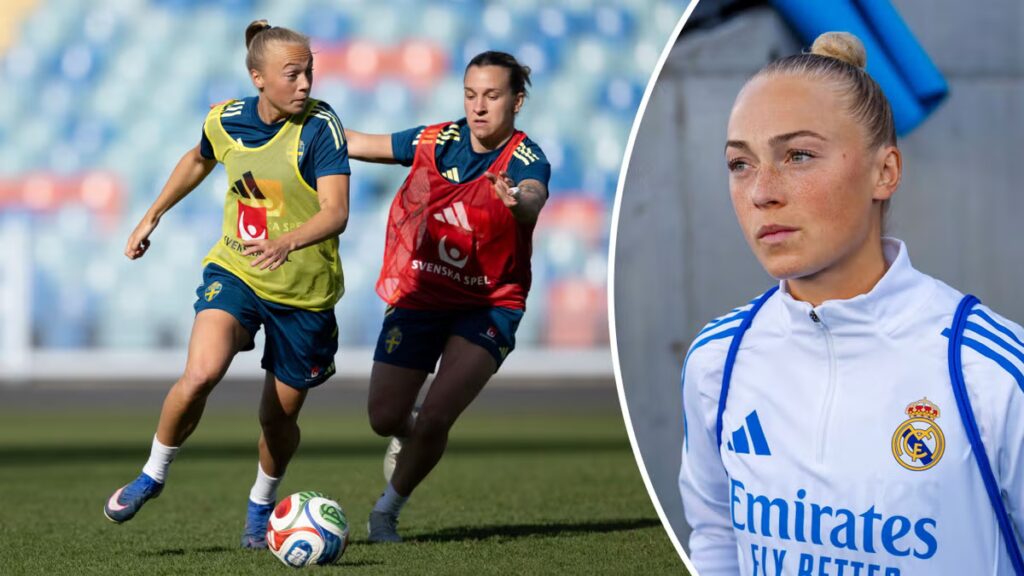 Hanna Bennison på träning med landslaget och i Actual Madrids kläder.