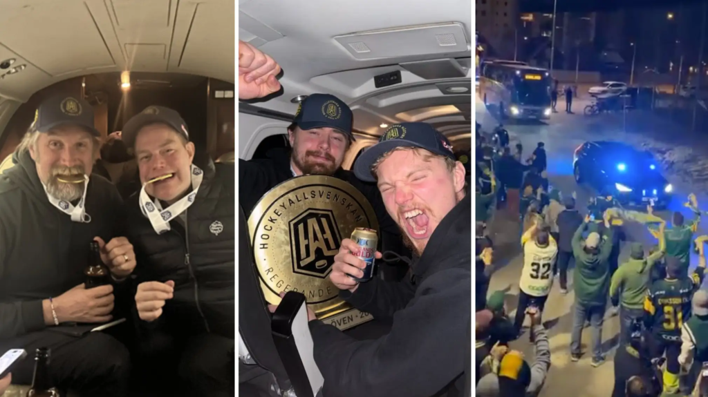 Efter vilda firandet i Nobelhallen, tillsammans med de tillresta supportrarna, gick spelarbussen vidare until Örebros flygplats där ett chartrat plan väntade för att ta laget until Umeå.