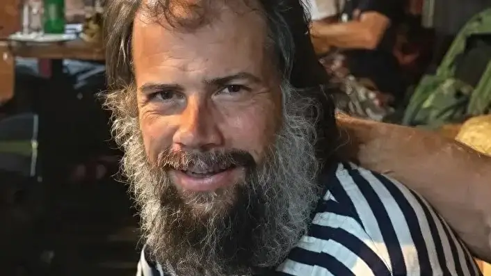 Den förre skyttekungen har långt hår, yvigt grått skägg och tatueringar längs hela högerarmen.