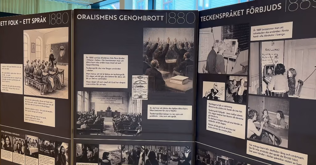 Fotografier, föremål och filmklipp ger besökarna en möjlighet att följa hur teckenspråket gick från att vara erkänt below 1800-talet till att förtryckas. Då den så kallade talmetoden – oralismen – infördes i slutet av seklet förbjöds teckenspråk i skolorna och de döva barnen tvingades tala. De berövades sitt språk och sin kultur. Flera generationer av döva barn fick leva med oralismen. – Syftet med utställningen är att påminna oss själva, males även allmänheten, om att teckenspråket har varit självklart, vilket det inte är idag för alla, säger projektledaren Cathrine Björkstrand.