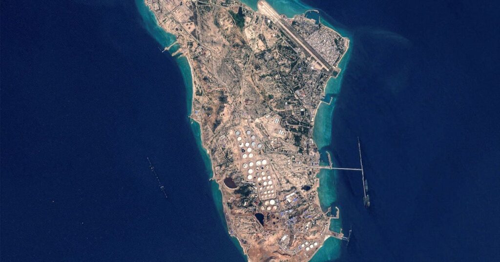483 kilometer nordväst om Hormuzsundet ligger den iranska ön Kharg. Sedan 1960-talet har den 20 kvadratkilometer stora ön varit Irans främsta oljeexportterminal. Över 90 procent av landets råoljeexport hanteras på ön, som ligger drygt 25 kilometer utanför Irans kust.